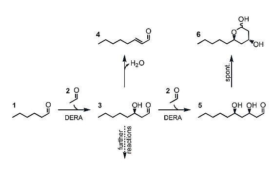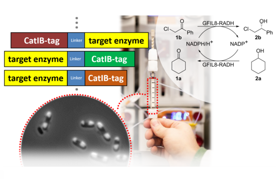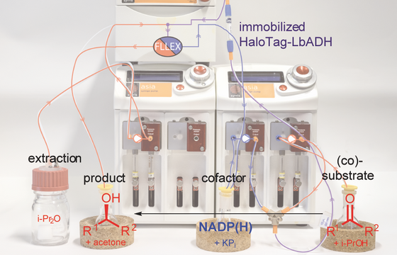 For an efficient use of the mentioned catalysts, immobilisation plays a major role. For this goal, we are evaluating different immobilisation strategies in our institute with regard to stability and activity. Besides the catalyst itself, the choice of the solid phase and the type of binding (e.g. physical or covalent) must also be considered in particular. Successful immobilisation will allow the catalyst to be reused. Finally, different enzymes (e.g. alcohol dehydrogenases (ADH) or the 2-deoxy-d-ribose-5-phosphate aldolase (DERA)), as well as different organocatalysts should be used to be able to stereoselectively obtain the desired products under the mildest possible conditions. In addition, the reusability of the catalyst and the targeted control of reaction conditions will contribute to sustainable chemistry.