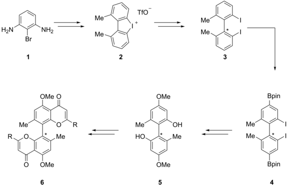 Die Forschungsaktivitäten unseres Instituts konzentrieren sich insbesondere auf axial chirale Biaryle. Diese weisen in der Nachbarschaft der C-C-Achse sterisch anspruchsvolle Reste auf, wodurch eine freie Rotation um diese verhindert wird. Dies führt zur Bildung konfigurativ stabiler Enantiomere.